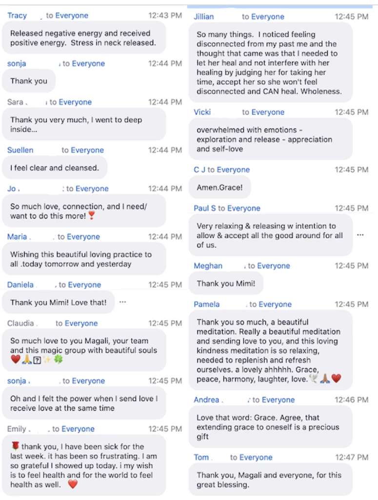 In less than an hour, my participants have had a powerful experience from the comfort of their own home! Here’s a screenshot of the group shares from just one minute of a recent class.
